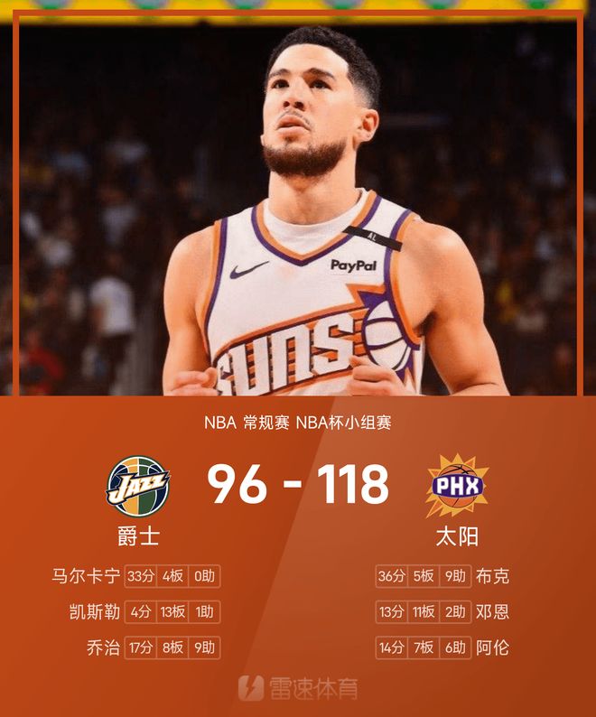 布克轰下36分5篮板9助攻,马尔卡宁33分难救主,太阳大胜爵士。