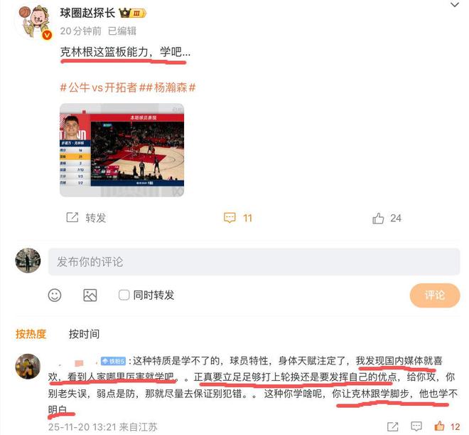 之前对阵公牛的比赛,克林根全场拿下17分21篮板4助攻,当时有媒体人就在社媒写道:“克林根这篮板能力,学吧。”不过不少理性的球迷还是不太买账:“这种特质是学不了的,球员特性,身体天赋注定了,我发现国内媒体就喜欢,看到人家哪里厉害就学吧。真要立足足够打上轮换还是要发挥自己的优点,给你攻,你别老失误,弱点是防,那就尽量去保证别犯错。这种你学啥呢,你让克林根学脚步,他也学不明白。”
